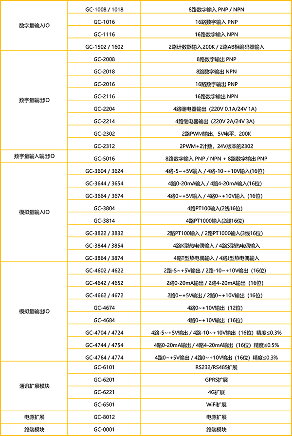 (2)支持IO接口擴展,擴展IO類型包括各種數(shù)字量模擬量輸入輸出IO(下圖表格部分展示)。最高可擴展數(shù)量達(dá)到512個。