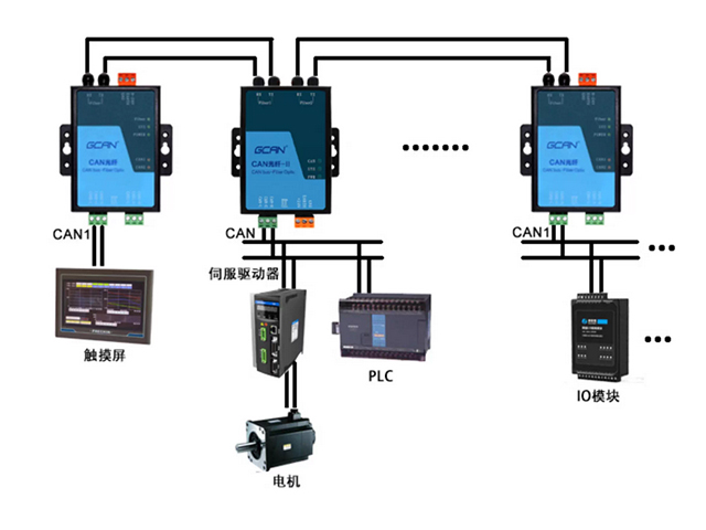 方法:在消防控制中心和各防火分區(qū)/設(shè)備間安裝CAN轉(zhuǎn)光纖模塊,通過光纖組網(wǎng)。