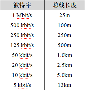 請注意:CAN-bus電纜可以使用普通雙絞線、屏蔽雙絞線。理論最大通信距離主要取決于總線波特率,最大總線長度和波特率關系詳見下表。若通訊距離超過1km,應保證線的截面積大于Φ1.0mm2,具體規(guī)格應根據(jù)距離而定,常規(guī)是隨距離的加長而適當加大。