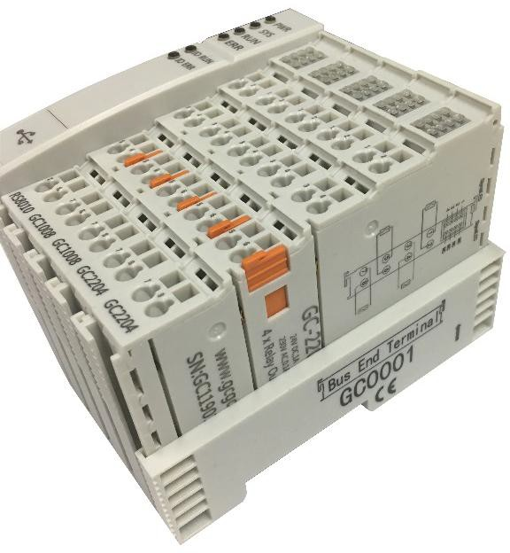 GCAN-PLC-510系列產(chǎn)品由一個可編程的主控模塊(GCAN-PLC-510)、若干GC系列IO模塊以及一個終端電阻模塊(GC-0001)組成。GCAN-PLC-510等主控模塊可連接所有的GC系列IO模塊,用戶可根據(jù)現(xiàn)場實際需求自行選擇擴展IO模塊,在電源供應充足情況下,IO模塊數(shù)量最多可擴展32個,其中當擴展模塊數(shù)量超過16片時,需額外增加一片IO供電擴展模塊GC 8012以保證電源供應充足,主控模塊可根據(jù)插入IO模塊的前后位置自動分配地址,實現(xiàn)自動組態(tài),用戶無需在PC上創(chuàng)建組態(tài)界面及設置參數(shù)。
