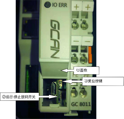 GCAN-PLC-400提供1個(gè)程序運(yùn)行開(kāi)關(guān)和1個(gè)復(fù)位按鍵。打開(kāi)蓋板后實(shí)物圖如下圖所示: