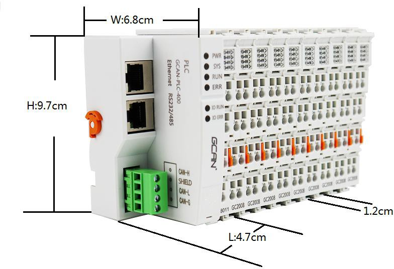 GCAN-PLC-400系列產(chǎn)品由一個(gè)可編程的主控模塊、若干GC系列IO模塊以及一個(gè)終端電阻模塊(GC-0001)組成。GCAN-PLC-400等主控模塊可連接所有的GC系列IO模塊,用戶可根據(jù)現(xiàn)場(chǎng)實(shí)際需求自行選擇擴(kuò)展IO模塊,在電源供應(yīng)充足情況下,IO模塊數(shù)量最多可擴(kuò)展32個(gè),其中當(dāng)擴(kuò)展模塊數(shù)量超過(guò)16片時(shí),需額外增加一片IO供電擴(kuò)展模塊GC 8012以保證電源供應(yīng)充足,主控模塊可根據(jù)插入IO模塊的前后位置自動(dòng)分配地址,實(shí)現(xiàn)自動(dòng)組態(tài),用戶無(wú)需在PC上創(chuàng)建組態(tài)界面及設(shè)置參數(shù)。