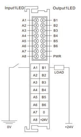 GCAN-PLC-301/302自帶8路輸入,6路輸出的數(shù)字量模塊。默認(rèn)發(fā)貨PNP型,需單獨(dú)外接電源使用(與GCAN-PLC-301/302電源隔離)。其中A1~A4為數(shù)字量輸入與高速計(jì)數(shù)輸入復(fù)用;B1~B4為數(shù)字量輸出與PWM高速脈沖輸出復(fù)用。接線時(shí)使用一字端子接頭的線纜,將端子接頭對(duì)準(zhǔn)相應(yīng)通道的圓孔插入即可;拆線時(shí),需使用一字螺絲刀,插入需拆線的通道對(duì)應(yīng)方形孔,用力向下按壓(也可輕微撬動(dòng)),此時(shí)相應(yīng)圓孔中的夾片會(huì)松動(dòng),線纜可輕松拔出。