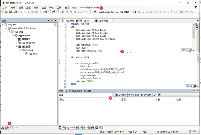 GCAN-PLC-301/302可使用OpenPCS軟件對(duì)其編程,也可使用Codesys V3.5 SP16及以上版本軟件對(duì)其編程。軟件支持符合IEC-61131-3標(biāo)準(zhǔn)中規(guī)定的五種標(biāo)準(zhǔn)編程語(yǔ)言,這使得程序的可移植性和復(fù)用性很強(qiáng),而且軟件還具有多種調(diào)試功能(斷點(diǎn)、單步等),調(diào)試程序更加方便。