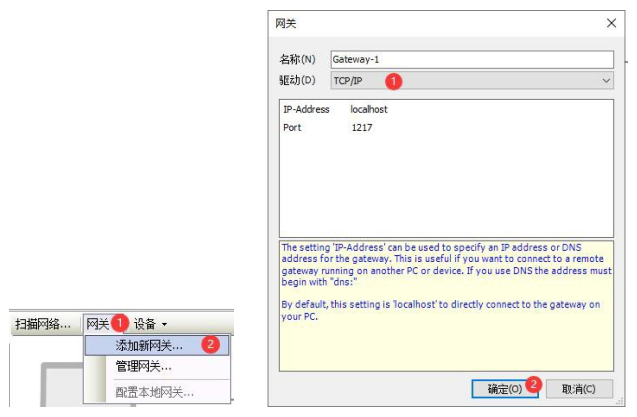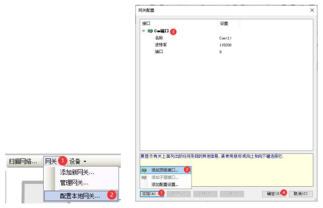 網(wǎng)關(guān)->添加新網(wǎng)關(guān),驅(qū)動(dòng)選TCP/IP,點(diǎn)擊“確定”按鈕;網(wǎng)關(guān)->配置本地網(wǎng)關(guān),添加頂級(jí)接口,選擇Com端口,波特率選擇115200,點(diǎn)擊“確定”按鈕。