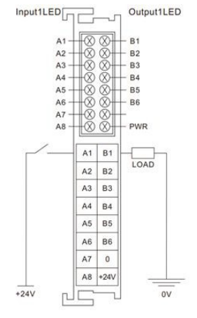 GCAN-PLC-320/321/322自帶8路輸入,6路輸出的數(shù)字量模塊。默認(rèn)發(fā)貨PNP型,需單獨(dú)外接電源使用(與GCAN-PLC-320/321/322電源隔離)。其中A1~A5為數(shù)字量輸入與高速計(jì)數(shù)輸入復(fù)用;B1~B5為數(shù)字量輸出與PWM高速脈沖輸出復(fù)用。接線時(shí)使用一字端子接頭的線纜,將端子接頭對(duì)準(zhǔn)相應(yīng)通道的圓孔插入即可;拆線時(shí),需使用一字螺絲刀,插入需拆線的通道對(duì)應(yīng)方形孔,用力向下按壓(也可輕微撬動(dòng)),此時(shí)相應(yīng)圓孔中的夾片會(huì)松動(dòng),線纜可輕松拔出。