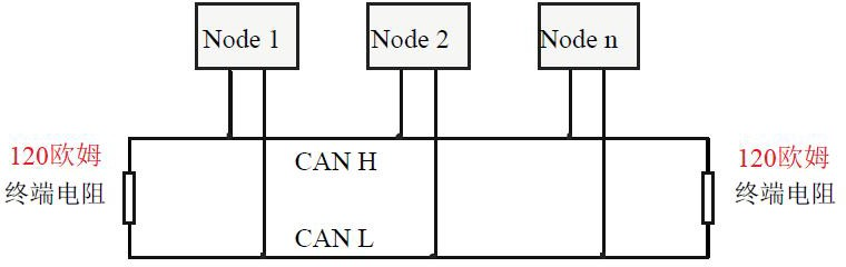 為了增強(qiáng)CAN通訊的可靠性,消除CAN總線終端信號(hào)反射干擾,CAN總線網(wǎng)絡(luò)最遠(yuǎn)的兩個(gè)端點(diǎn)通常要加入終端匹配電阻,如圖所示。終端匹配電阻的值由傳輸電纜的特性阻抗所決定。例如雙絞線的特性阻抗為120Ω,則總線上的兩個(gè)端點(diǎn)也應(yīng)集成120Ω終端電阻。如果網(wǎng)絡(luò)上其他節(jié)點(diǎn)使用不同的收發(fā)器,則終端電阻須另外計(jì)算。