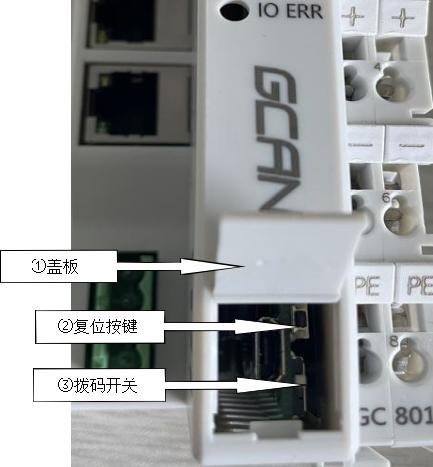 GCAN-PLC-320/321/322提供1個(gè)程序運(yùn)行開(kāi)關(guān)和1個(gè)復(fù)位按鈕。打開(kāi)蓋板后實(shí)物圖如圖所示。