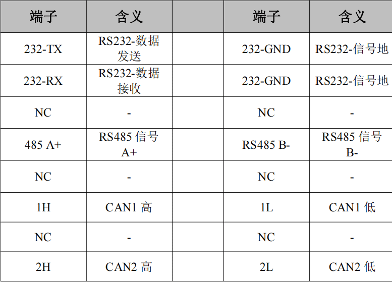 端子接口包括1個(gè)RS232、1個(gè)RS485,2個(gè)CAN總線接口,使用插拔式雙排彈簧按壓式端子引出。