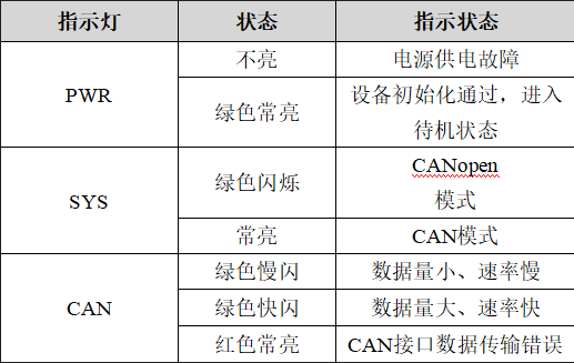 GCAN-4057模塊具有1個(gè)PWR指示燈、1個(gè)SYS指示燈、1個(gè)CAN指示燈來指示設(shè)備的運(yùn)行狀態(tài)。這3種指示燈的具體指示功能及狀態(tài)如表所示。