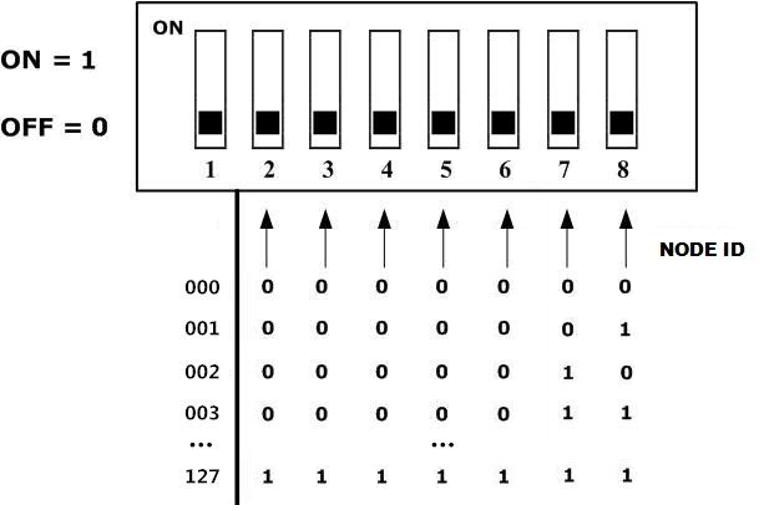 如圖所示,撥碼開關(guān)的每個(gè)位撥向“ON”位置時(shí),該位為“1”,如果撥向“OFF”位置,則該位為“0”。撥碼開關(guān)的2—8位用于設(shè)定模塊的節(jié)點(diǎn)號(NODE ID),第八位為最低位,第二位為最高位,模塊的節(jié)點(diǎn)號(NODE ID)是各位對應(yīng)的十進(jìn)制值之和,通過撥碼開關(guān)設(shè)定模塊的節(jié)點(diǎn)號(NODE ID)的有效范圍為0~127。