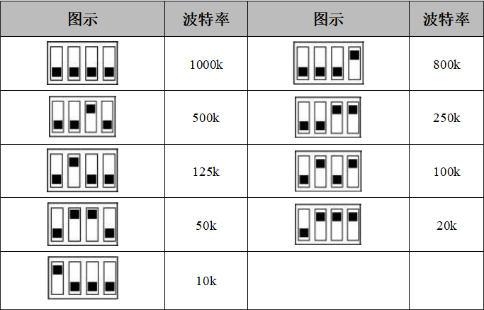 右側(cè)撥碼開關(guān)的1-4位用于設(shè)定模塊的波特率,第一位為低位,第四位為高位。波特率與開關(guān)設(shè)置對應(yīng)值如下表所示。