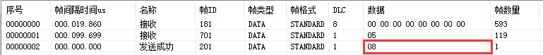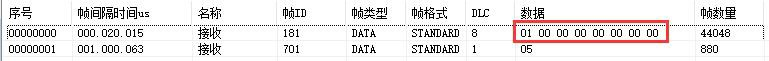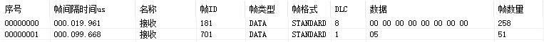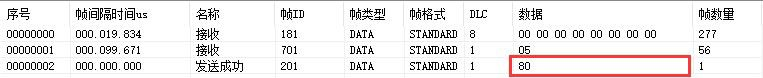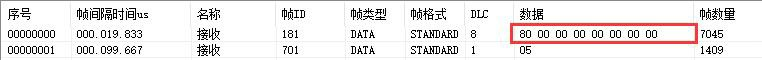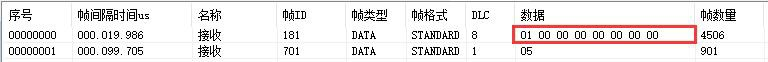 例如:默認(rèn)GCAN-4057的Node ID為1(以下節(jié)點(diǎn)號均為1),則主站設(shè)備可接收到一條節(jié)點(diǎn)狀態(tài)數(shù)據(jù),幀ID為0x701,標(biāo)準(zhǔn)幀,數(shù)據(jù)為0x05,默認(rèn)心跳時(shí)間100ms。