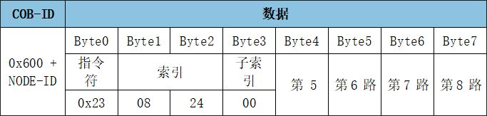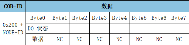 RPDO1用于表示控制(寫入)數(shù)字量輸出的狀態(tài),幀ID為0x200+Node ID,數(shù)字量輸出默認(rèn)由一個(gè)字節(jié)來控制(寫入)。
