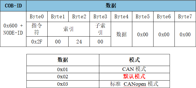 GCAN-4057模塊可通過發(fā)送SDO命令寫參數(shù),修改模塊的使用模式。該參數(shù)位于對象字典索引0x2400、子索引0x00,數(shù)據(jù)類型Unsigned8。