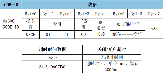 GCAN-4057模塊可通過發(fā)送SDO命令寫參數(shù),修改DO超時(shí)時(shí)間,DO數(shù)據(jù)長度。該傳輸類型的數(shù)據(jù)位于對象字典索引0x2401、子索引0x00,數(shù)據(jù)類型Unsigned8。超時(shí)時(shí)間:默認(rèn)輸出2S后,4057模塊停止輸出。