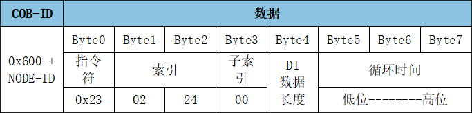 (1)修改CAN模式下DI輸入數(shù)據(jù)長度、循環(huán)時(shí)間GCAN-4057模塊可通過發(fā)送SDO命令寫參數(shù),修改DI數(shù)據(jù)長度、循環(huán)時(shí)間。該傳輸類型的數(shù)據(jù)位于對象字典索引0x2402、子索引0x00,數(shù)據(jù)類型Unsigned32。