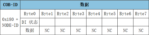 當(dāng)前狀態(tài),TPDO1用于表示數(shù)字量DI狀態(tài),如圖所示,幀ID為0x180+Node ID,默認(rèn)幀數(shù)據(jù)第一個(gè)字節(jié)為數(shù)字量輸入狀態(tài)。