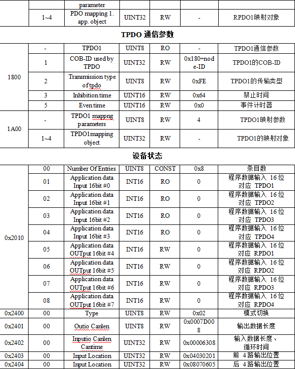 后4路傳輸類型的數(shù)據(jù)位于對象字典索引0x2404、子索引0x00,數(shù)據(jù)類型Unsigned32。最多設(shè)置在第64位。換算成16進(jìn)制,數(shù)據(jù)最低0x01,最高0x40,0x00或者0x40以上不生效。