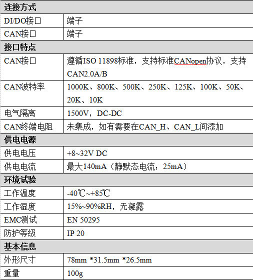 (1)CAN-bus支持CAN2.0A和CAN2.0B幀格式,符合ISO/DIS 11898規(guī)范;(2)CAN-bus通訊波特率在10Kbps~1Mbps之間任意可編程;(3)CAN-bus接口采用電氣隔離,隔離模塊絕緣電壓:1500V DC;(4)使用9~30V DC供電,140mA(靜默態(tài)電流:40mA);(5)數(shù)字量輸入通道數(shù):8路;(6)數(shù)字量輸出通道數(shù):8路;(7)數(shù)字量輸入信號:支持PNP型、NPN型,通過COM端切換;(8)數(shù)字量輸入高電平信號(數(shù)字1):+5V~30V;(9)數(shù)字量輸入低電平信號(數(shù)字0):≤+3V;(10)數(shù)字量輸出信號:PNP輸出,單路最大500mA;8路同時(shí)輸出350mA/每路;(11)DI、DO、CANopen接口使用端子接口;(12)使用撥碼開關(guān)配置模塊波特率及節(jié)點(diǎn)號;(13)靜電放電抗擾度等級:接觸放電±4kV,空氣放電±8kV;(14)電快速瞬變脈沖群抗擾度等級:電源接口、CAN接口±2kV;IO接口±1kV;(15)浪涌抗擾度等級:電源接口、IO接口±1kV、CAN接口±4kV;(16)可用配套卡軌連接件,安裝到DIN卡軌上;(17)工作溫度范圍:-40℃~+85℃;