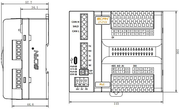 GCAN-PLC-220外觀如圖所示,(長(zhǎng))115mm*(寬)100mm*(高)58mm。