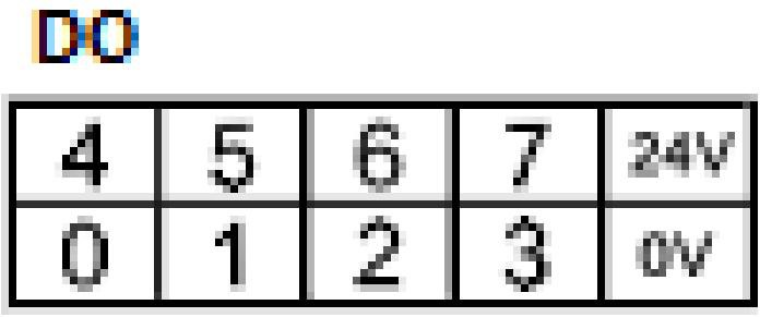 GCAN-PLC-220的主控模塊右側(cè)頂板含有上下四排端子排,下方兩排端子排的右側(cè)為DO端子排,分別為DO0~DO7共8個(gè)數(shù)字量輸出點(diǎn),以及1組IO供電電源接口(IO供電電源已與系統(tǒng)電源隔離,IO模塊需供電后才能正常工作),如圖所示。各個(gè)端子對(duì)應(yīng)的序號(hào)及其含義如表所示。
