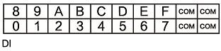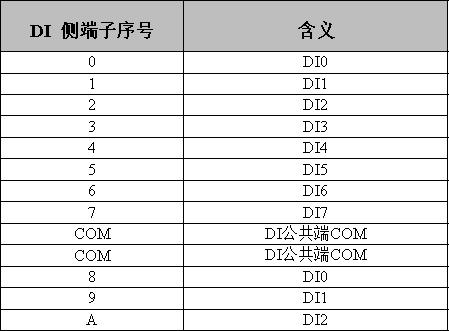 上方兩排端子為DI端子排,分別為DI0~DI7,DI8~DIF共16個(gè)數(shù)字量輸入點(diǎn),以及4個(gè)DI的COM接口(4個(gè)COM口內(nèi)部已短接,任意連接1個(gè)即可),如圖所示。各個(gè)端子對(duì)應(yīng)的序號(hào)及其含義如表所示。