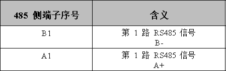 下方兩排端子排的左側(cè)為第1路RS485、AI和AO端子排,如圖所示。RS485端子對(duì)應(yīng)的序號(hào)及其含義如表所示。