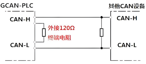 請(qǐng)注意:GCAN-PLC-220的CAN總線內(nèi)部未集成120Ω終端電阻。如果節(jié)點(diǎn)數(shù)目大于2,中間節(jié)點(diǎn)不需要安裝120Ω的終端電阻。需要使用時(shí),將電阻兩端分別接入CAN_H、CAN_L即可,如圖所示。