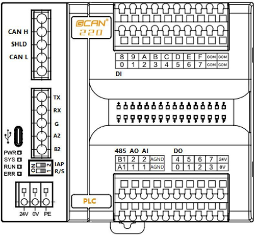 GCAN-PLC-220設(shè)備包含1個(gè)電源接口,一個(gè)USB-Type C接口,1路CAN通信接口,2路RS485通信接口,1路RS232通信接口,2路AI接口;2路AO接口;8路DO接口,16路DI接口。控制器編程接口使用USB接口,接口定義如下表所示。
