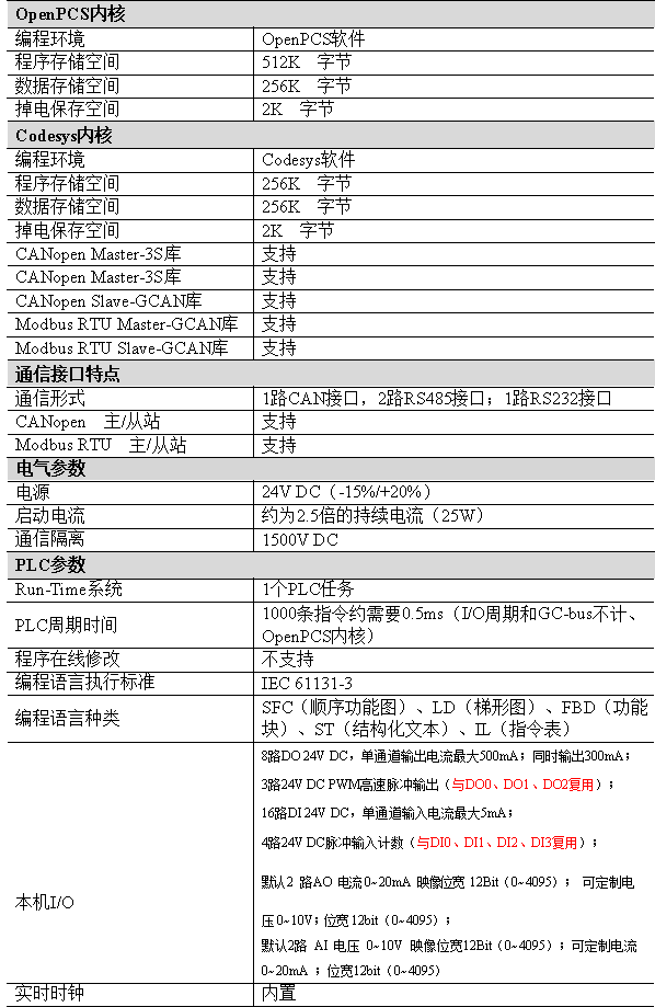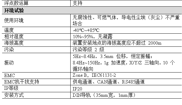 (1)編程軟件:OpenPCS/CodeSys(編程語(yǔ)言符合IEC61131-3標(biāo)準(zhǔn));(2)1路CAN通道;1路RS232通道;2路RS485通道;(3)支持CANopen主/從站功能;(4)支持Modbus RTU主/從站功能;(5)8路DO(3路PWM脈沖輸出);16路DI(4路計(jì)數(shù)輸入);(6)2路AO、2路AI;(均可定制電流型或電壓型);(7)電源采用24V DC(-15%/+20%);(8)通信隔離為1500V DC(除RS232);(9)工作溫度范圍:-40℃~+85℃;(10)防護(hù)等級(jí):IP20;(11)EMC抗干擾等級(jí):Zone B;(12)EMC抗干擾支持:供電通道、RS485通道、CAN通道;(13)尺寸:(長(zhǎng))115mm*(寬)100mm*(高)58mm。-