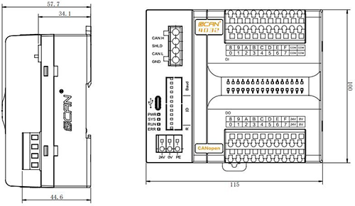 (1)CAN-bus支持CAN2.0A和CAN2.0B幀格式,符合ISO/DIS 11898規(guī)范;(2)CAN-bus通訊波特率在10Kbps~1Mbps之間任意可編程;(3)CAN-bus接口采用電氣隔離,隔離模塊絕緣電壓:DC 1500V;(4)電源采用24V DC(-15%/+20%);(5)數(shù)字量輸入通道數(shù):16路;(6)數(shù)字量輸出通道數(shù):16路;(7)數(shù)字量輸入、輸出信號(hào):輸入可通過接線切換源/漏型;輸出默認(rèn)晶體管PNP輸出,可選NPN輸出;(8)數(shù)字量輸入ON信號(hào):電壓≥9V DC;輸入OFF信號(hào):電壓≤5V DC;(9)PNP源型數(shù)字量輸出電壓為IO的工作電壓24V,輸出電流最大值為500mA(單通道);300mA(通道同時(shí)輸出);(10)NPN漏型數(shù)字量輸出電壓為IO的工作電壓24V,輸出電流最大值為500mA(單通道);280mA(通道同時(shí)輸出);(11)EMC抗干擾通道支持:模塊供電通道、CAN通道;(12)模塊供電通道:靜電接觸放電±4KV,靜電空氣放電±8KV,電快速瞬變脈沖群±2KV,雷擊(浪涌)±1KV;(13)CAN通道:1500VDC電氣隔離,靜電接觸放電±8KV,電快速瞬變脈沖群±2KV,雷擊(浪涌)±4KV;使用撥碼開關(guān)配置模塊波特率及節(jié)點(diǎn)號(hào);(14)工作溫度范圍:-40℃~+85℃;(15)尺寸:長(zhǎng)115mm*寬100mm*高58mm。