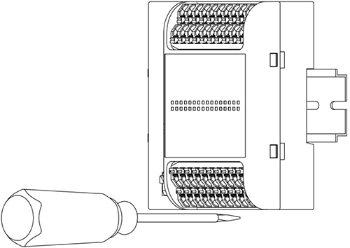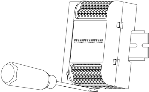先將模塊下方的導(dǎo)軌卡扣用一字螺絲刀拉出;然后將模塊掛到DIN導(dǎo)軌上,并使用一字螺絲刀將下方的導(dǎo)軌卡扣推進(jìn)去鎖定,如圖所示: