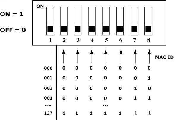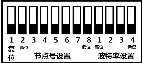 如圖所示,撥碼開關(guān)的每個(gè)位撥向“ON“位置時(shí),該位為“1”,如果撥向“OFF”位置,則該位為“0”。撥碼開關(guān)的2-8位用于設(shè)定模塊的節(jié)點(diǎn)號(hào)(MAC ID),第八位為最低位,第二位為最高位,模塊的節(jié)點(diǎn)號(hào)(MAC ID)是各位對(duì)應(yīng)的十進(jìn)制值之和,通過撥碼開關(guān)設(shè)定模塊的節(jié)點(diǎn)號(hào)(MAC ID)的有效范圍為0~127。