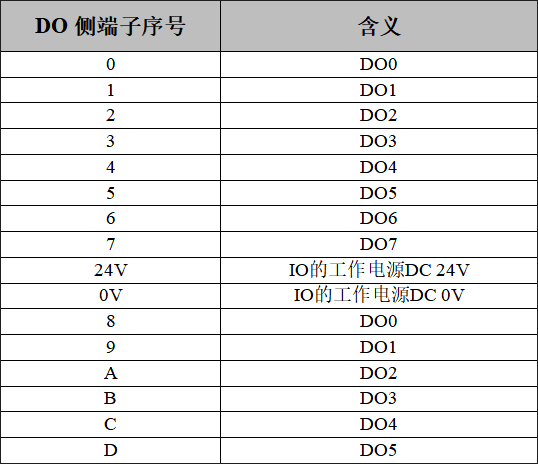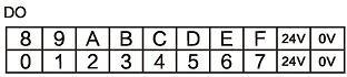 GCAN-4032的主控模塊含有上下四排端子排,下方兩排端子排為DO端子排,分別為DO0~DO7,DO8~DOF共16個(gè)數(shù)字量輸出點(diǎn),以及2組IO工作電源接口(請(qǐng)任選1組IO工作電源接口接入24V即可,注意同時(shí)需要接入系統(tǒng)電源,系統(tǒng)電源詳見下表,IO工作電源與系統(tǒng)電源彼此隔離),如圖所示。各個(gè)端子對(duì)應(yīng)的序號(hào)及其含義如下表所示。