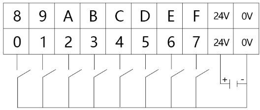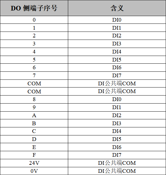 上方兩排端子為DI端子排,分別為DI0~DI7,DI8~DIF共16個(gè)數(shù)字量輸入點(diǎn),以及4個(gè)DI的COM接口(4個(gè)COM口任意連接1個(gè)即可),如圖所示。各個(gè)端子對(duì)應(yīng)的序號(hào)及其含義如表所示。