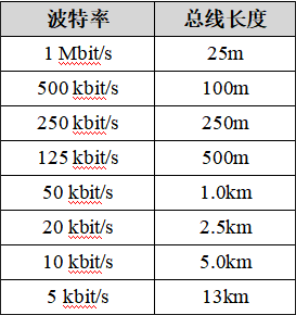 CAN-bus網(wǎng)絡(luò)的拓?fù)浣Y(jié)構(gòu)請(qǐng)注意:CAN-bus電纜可以使用普通雙絞線、屏蔽雙絞線。理論最大通信距離主要取決于總線波特率,最大總線長(zhǎng)度和波特率關(guān)系詳見下表。若通訊距離超過1km,應(yīng)保證線的截面積大于Φ1.0mm2,具體規(guī)格應(yīng)根據(jù)距離而定,常規(guī)是隨距離的加長(zhǎng)而適當(dāng)加大。