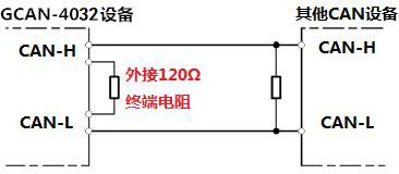 請(qǐng)注意:GCAN-4032模塊內(nèi)部未集成120Ω終端電阻。如果節(jié)點(diǎn)數(shù)目大于2,中間節(jié)點(diǎn)不需要安裝120Ω的終端電阻。需要使用時(shí),將電阻兩端分別接入CAN_H、CAN_L即可,如圖所示。