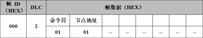 GCAN-4032模塊接收由主站發(fā)出的操作指令,幀ID為0x000,DLC為2,幀數(shù)據(jù)第一個(gè)字節(jié)為命令符,第二個(gè)字節(jié)為節(jié)點(diǎn)號(hào)(00則為全部節(jié)點(diǎn))。