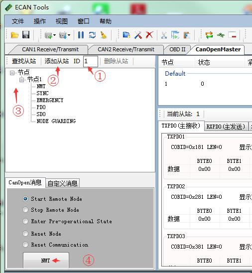 例如:GCAN-4032的Node ID為1,命令GCAN-4032為進(jìn)入操作狀態(tài)(01),則NMT命令幀ID為0x000,幀數(shù)據(jù)為0x01,0x01。該命令也可由GCANTools軟件的CANopenMaster插件發(fā)出。