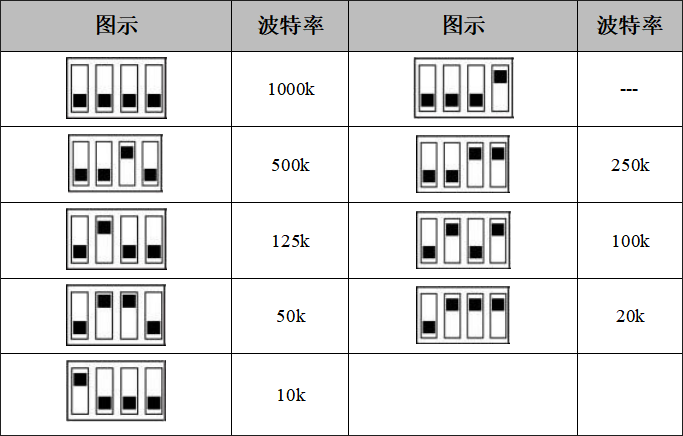 右側(cè)撥碼開關(guān)的1-4位用于設(shè)定模塊的波特率,第一位為低位,第四位為高位。波特率與開關(guān)設(shè)置對(duì)應(yīng)值如下表所示。