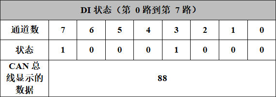例如,GCAN-4032模塊節(jié)點(diǎn)號(hào)設(shè)為1。通道7和通道3狀態(tài)為1,其他狀態(tài)均為0,則CAN總線一端顯示的DI狀態(tài)數(shù)據(jù)為88 00。則發(fā)出的幀ID為0x181,數(shù)據(jù)長(zhǎng)度(DLC)為2,幀數(shù)據(jù)為0x88,0x00。