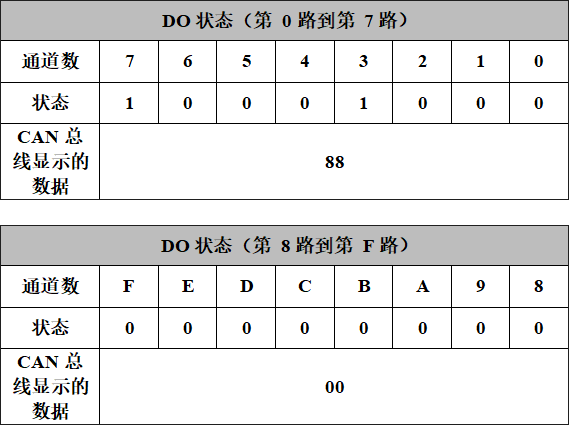 數(shù)字量輸出的狀態(tài)由兩個(gè)字節(jié)來(lái)表示,第0到7路由第一個(gè)字節(jié)表示;第8到F路由第二個(gè)字節(jié)表示。舉例:第一個(gè)字節(jié)里通道8在高位,通道1在低位。