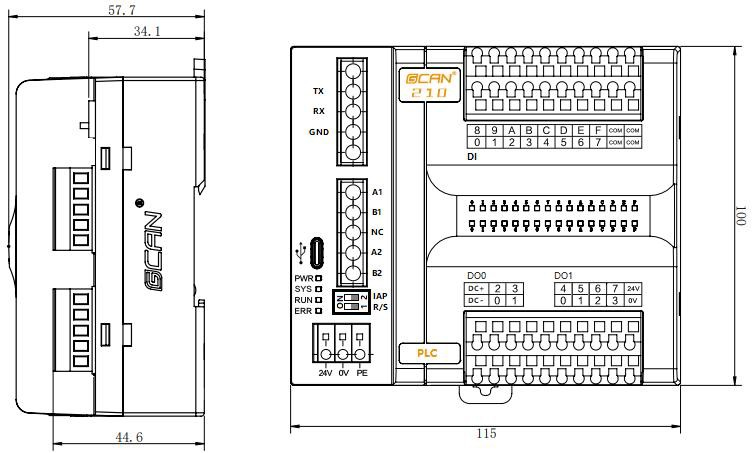 GCAN-PLC-210外觀如圖2.1所示,(長)115mm*(寬)100mm*(高)58mm。