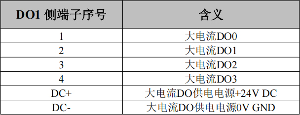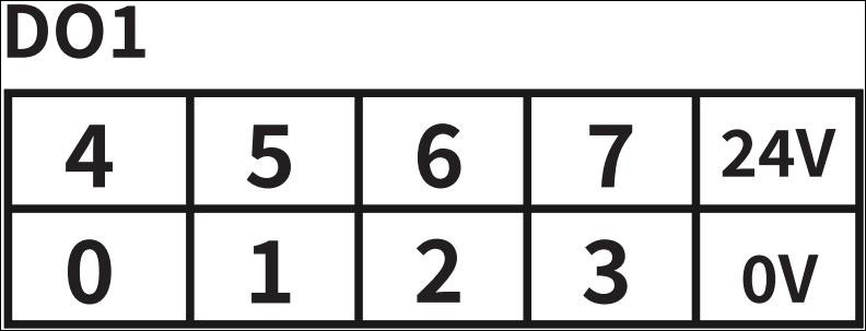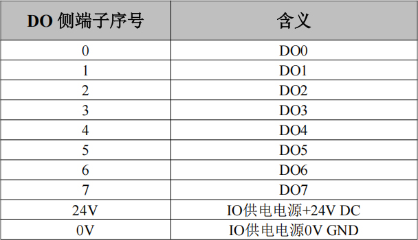 下方兩排端子排的右側(cè)為普通DO1端子排,分別為DO0~DO7共8個數(shù)字量輸出點(diǎn),以及1組IO供電電源接口(IO供電電源已與系統(tǒng)電源隔離,IO模塊需供電后才能正常工作),如圖所示。各個端子對應(yīng)的序號及其含義如表2.5所示。
