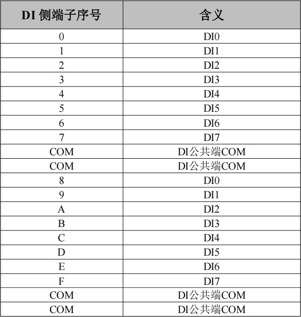上方兩排端子為DI端子排,分別為DI0~DI7,DI8~DIF共16個數(shù)字量輸入點(diǎn),以及4個DI的COM接口(4個COM口內(nèi)部已短接,任意連接1個即可),如圖所示。各個端子對應(yīng)的序號及其含義如表2.6所示。