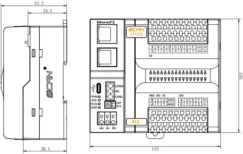 圖2.1 GCAN-PLC-240模塊外形尺寸圖