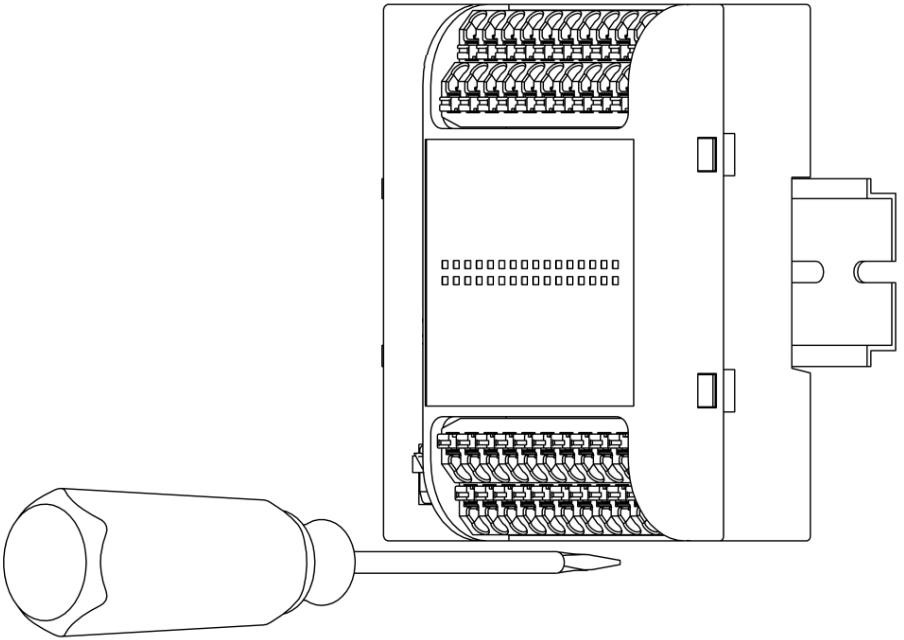 先將模塊下方的導(dǎo)軌卡扣用一字螺絲刀拉出;然后將模塊掛到DIN導(dǎo)軌上,并使用一字螺絲刀將下方的導(dǎo)軌卡扣推進去鎖定,如圖所示: