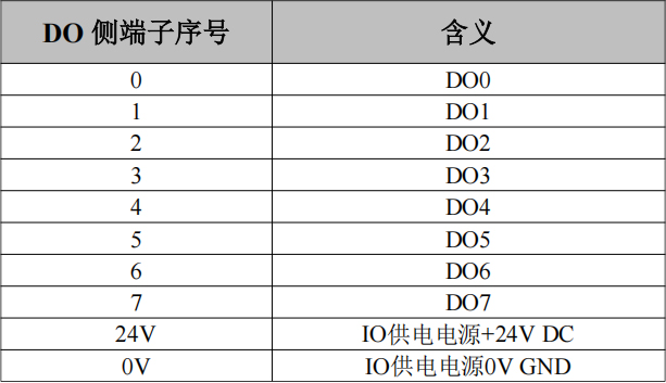 GCAN-PLC-240的主控模塊右側(cè)頂板含有上下四排端子排,下方兩排端子排的右側(cè)為DO端子排,分別為DO0~DO7共8個數(shù)字量輸出點,以及1組IO供電電源接口(IO供電電源已與系統(tǒng)電源隔離,IO模塊需供電后才能正常工作),如圖所示。各個端子對應(yīng)的序號及其含義如表2.3所示。
