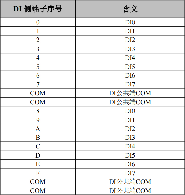 上方兩排端子為DI端子排,分別為DI0~DI7,DI8~DIF共16個數(shù)字量輸入點,以及4個DI的COM接口(4個COM口內(nèi)部已短接,任意連接1個即可),如圖所示。各個端子對應(yīng)的序號及其含義如表2.4所示。